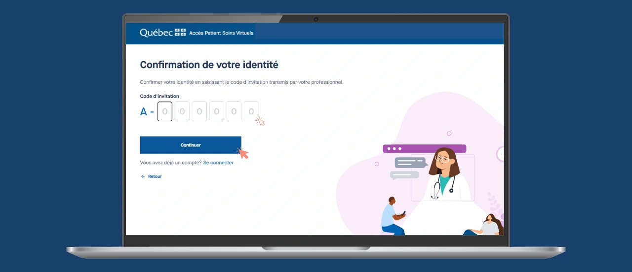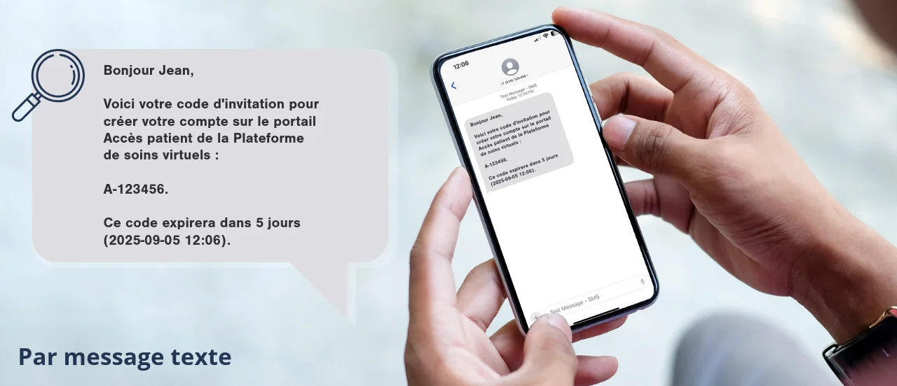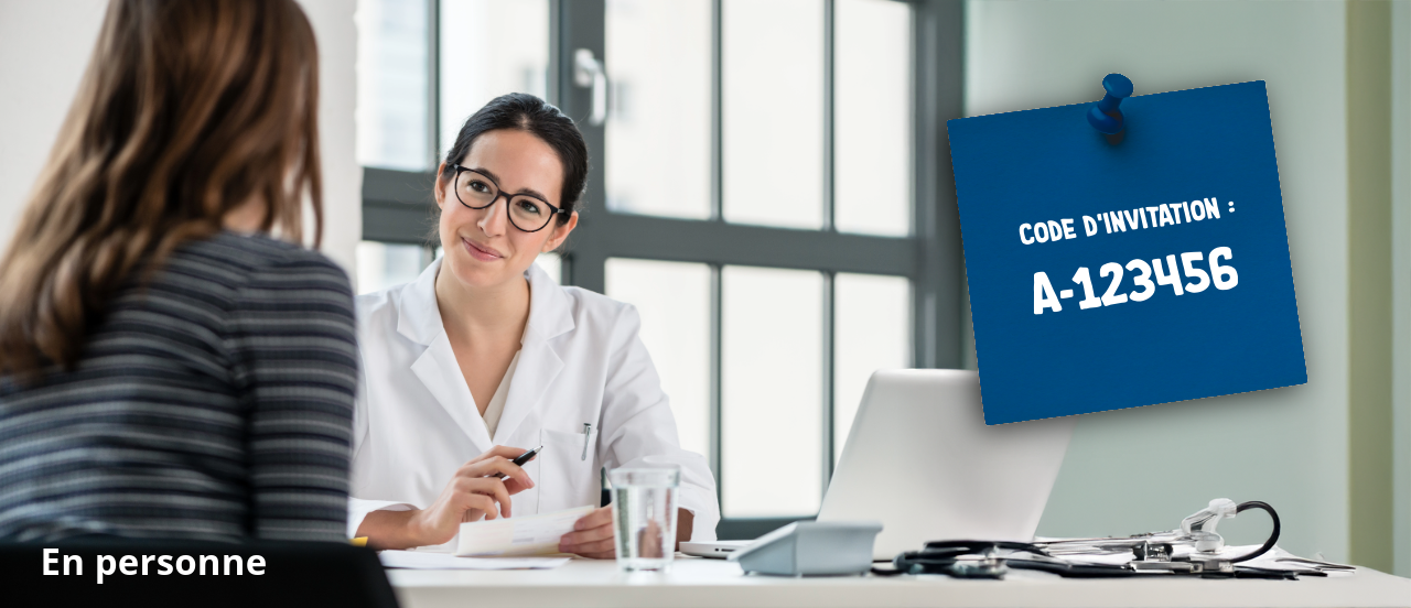 Votre professionnel de la santé vous a remis un code d’invitation (format A-123456). Ce code vous a normalement été remis en personne (lors d’un rendez-vous) ou par message texte.